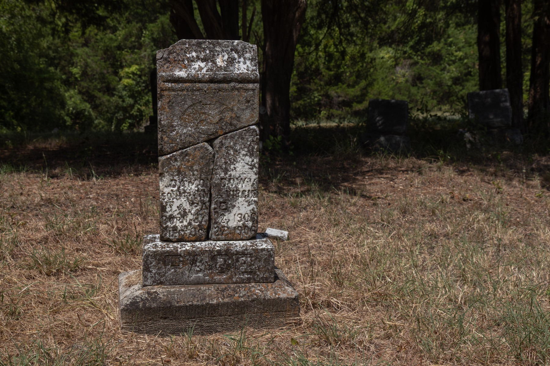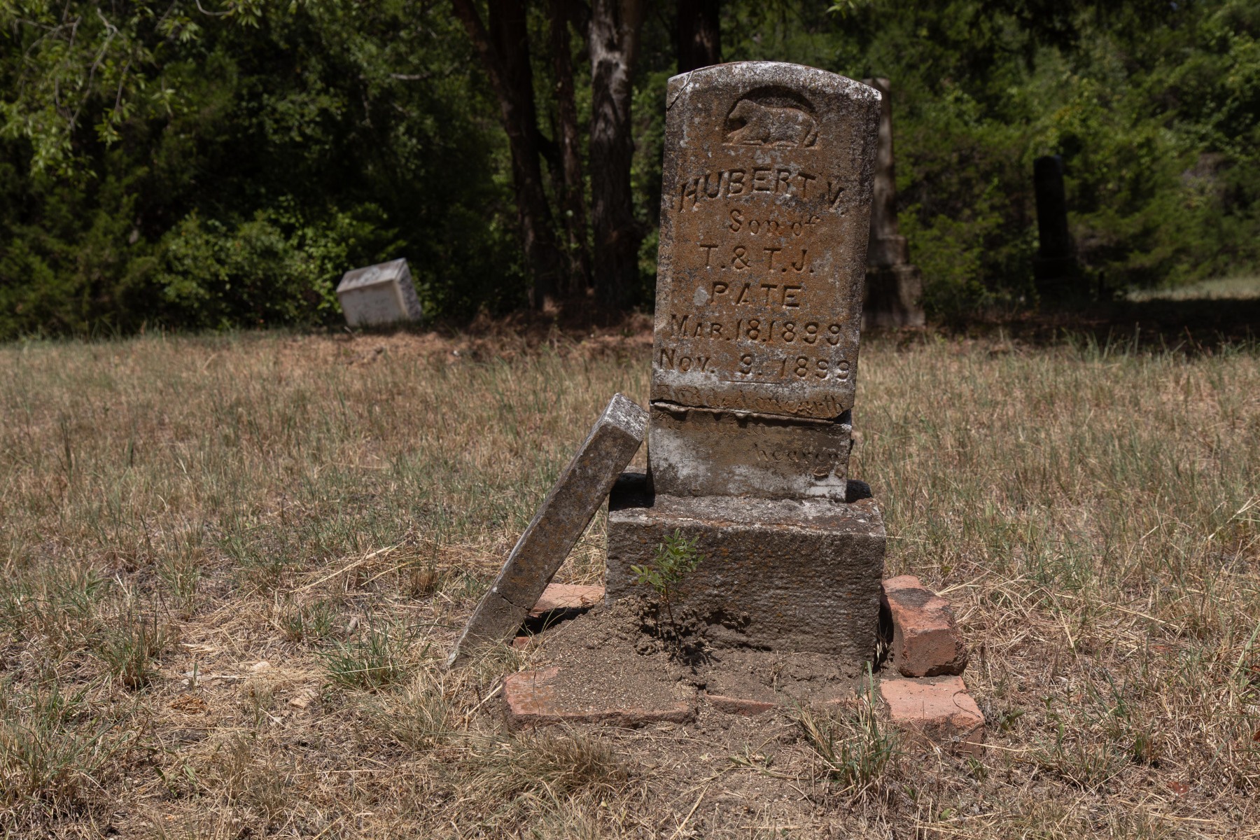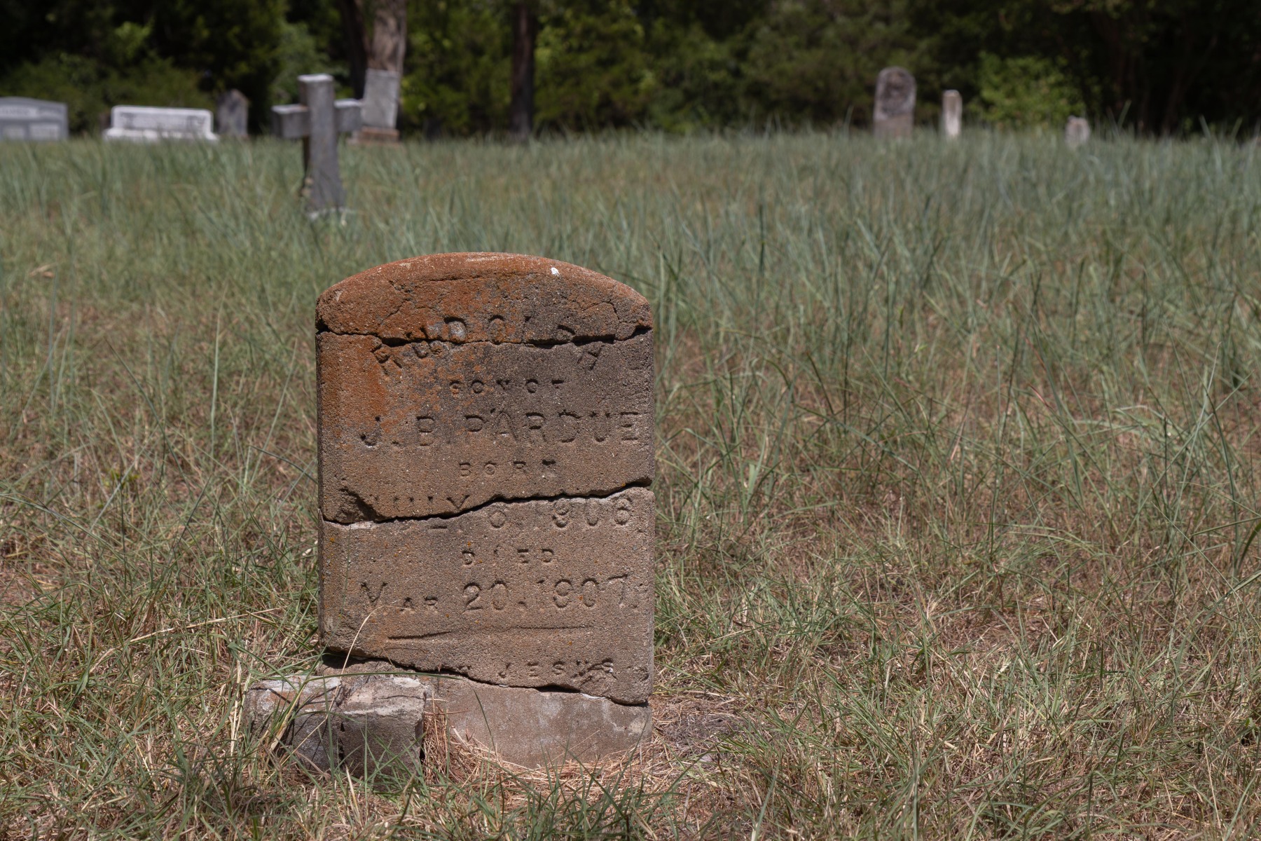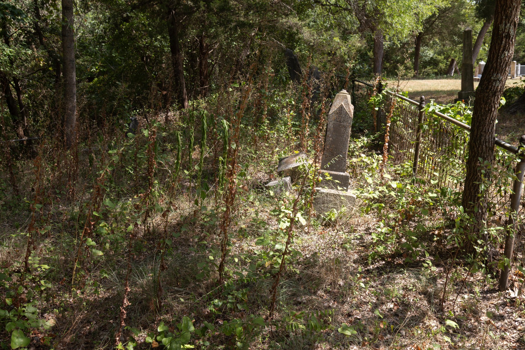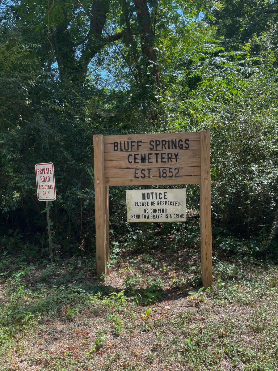 After driving down a narrow, partially washed out dirt road outside the town of Ferris, is the Bluff Springs Cemetery. The expansive lot contains several clusters of family plots dating from 1852 – 1968 with a total of 186 graves. Much of the open areas are still being maintained but some are overgrown.