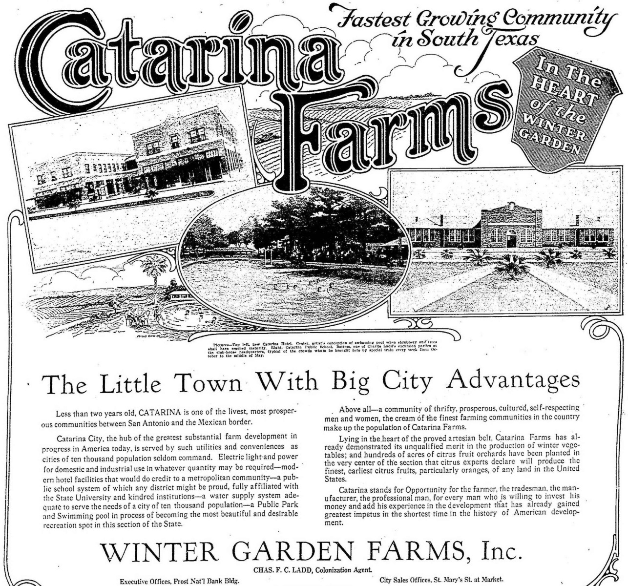 Winter Garden Farms, Inc. purchased the 225,000 acre Taft-Catarina ranch to section off into subdivisions, with new roads and bridges to attract new settlers. Experts were brought in to design roads, bridges, and a water works system equipped to serve a city of 10,000. Citrus trees and vegetables were imported to add diversity to the natural vegetation and mesquite.