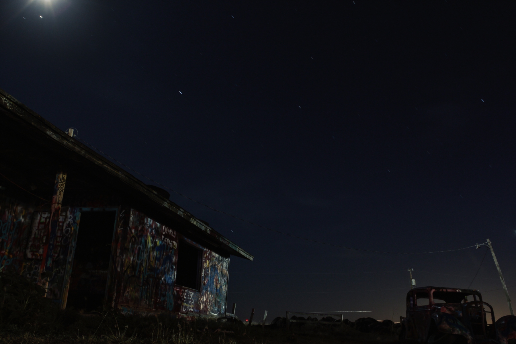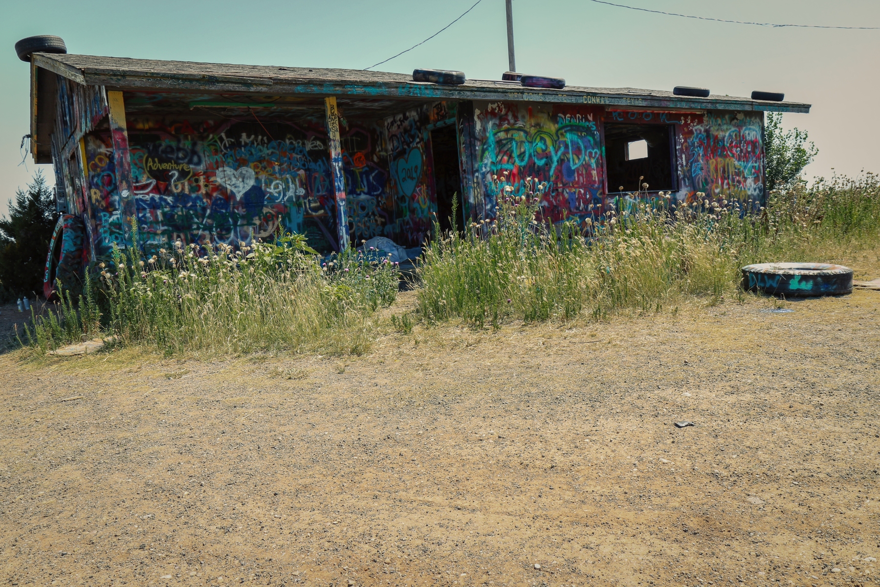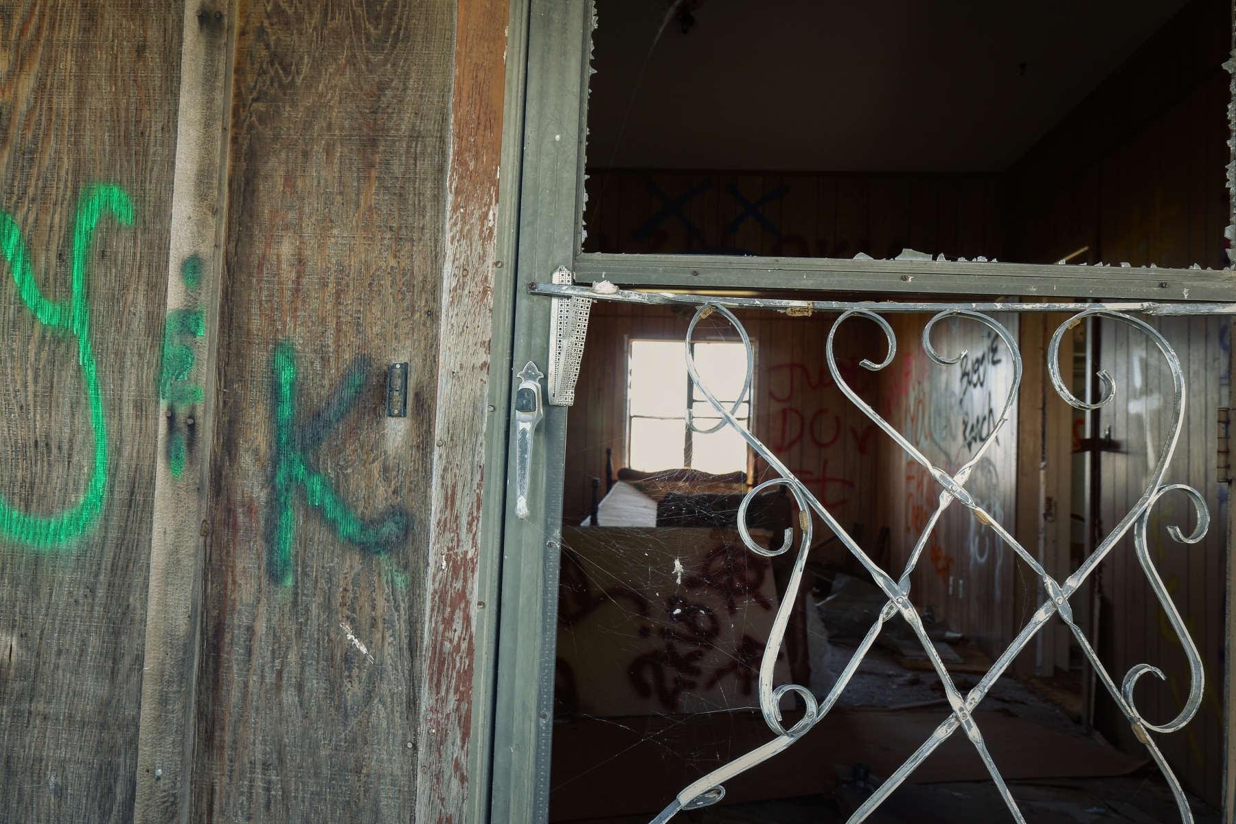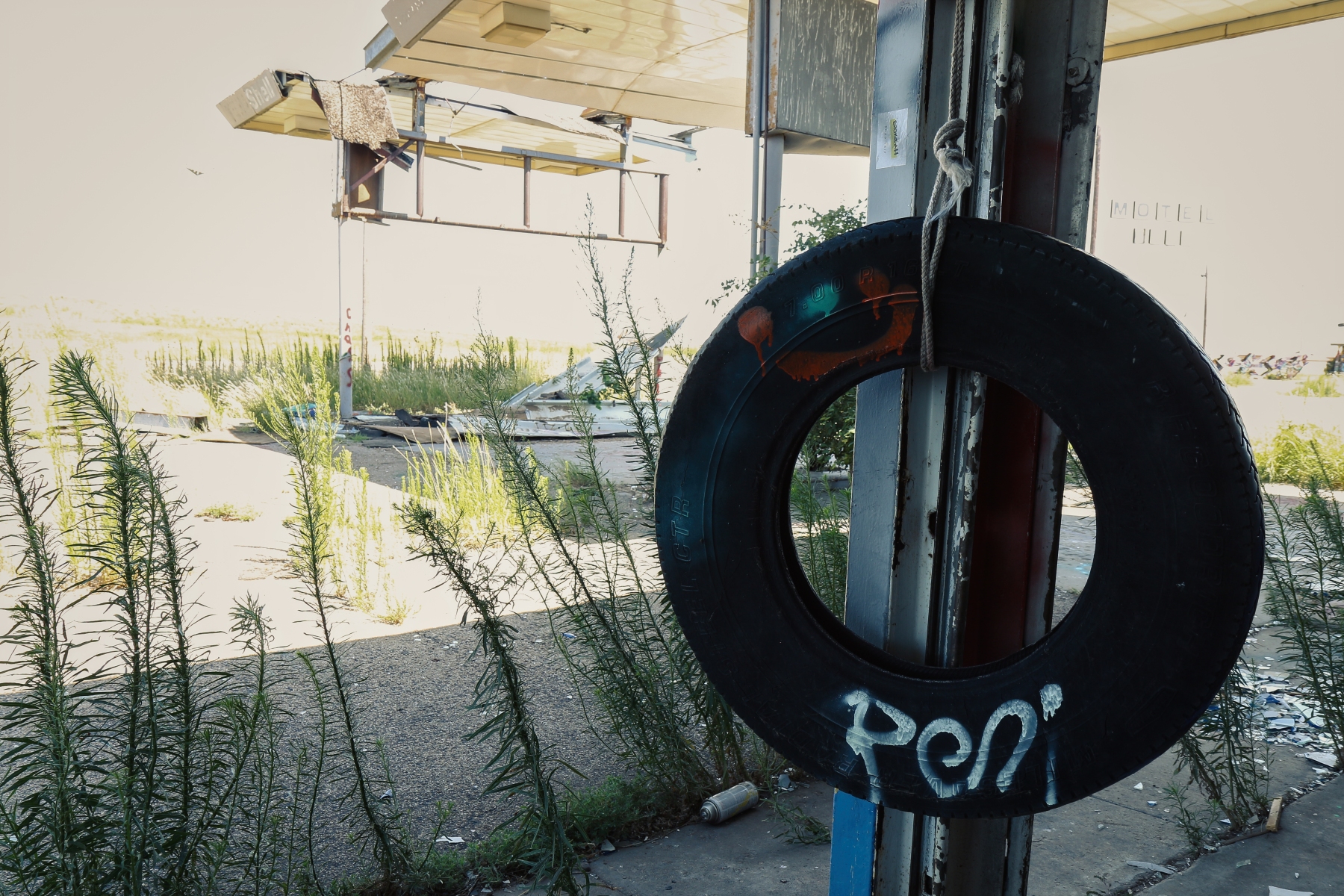 The Longhorn and Bug Ranches are now badly vandalized and the Beetles are covered with as much spray paint as their cousin to the West. Additional remains of Conway, a mile south, include a boarded up school (built in 1930), several small structures in conditions varying from barely holding on to piles of wood, residents of 3 newer houses, and 2 sets of grain elevators built next to an abandoned railway.