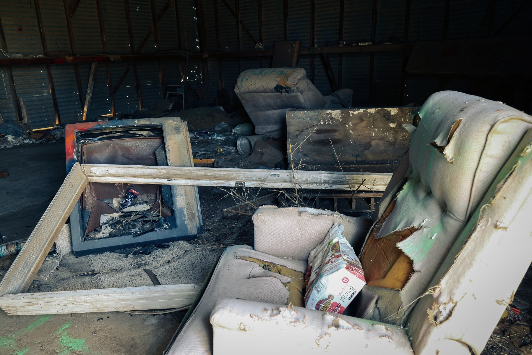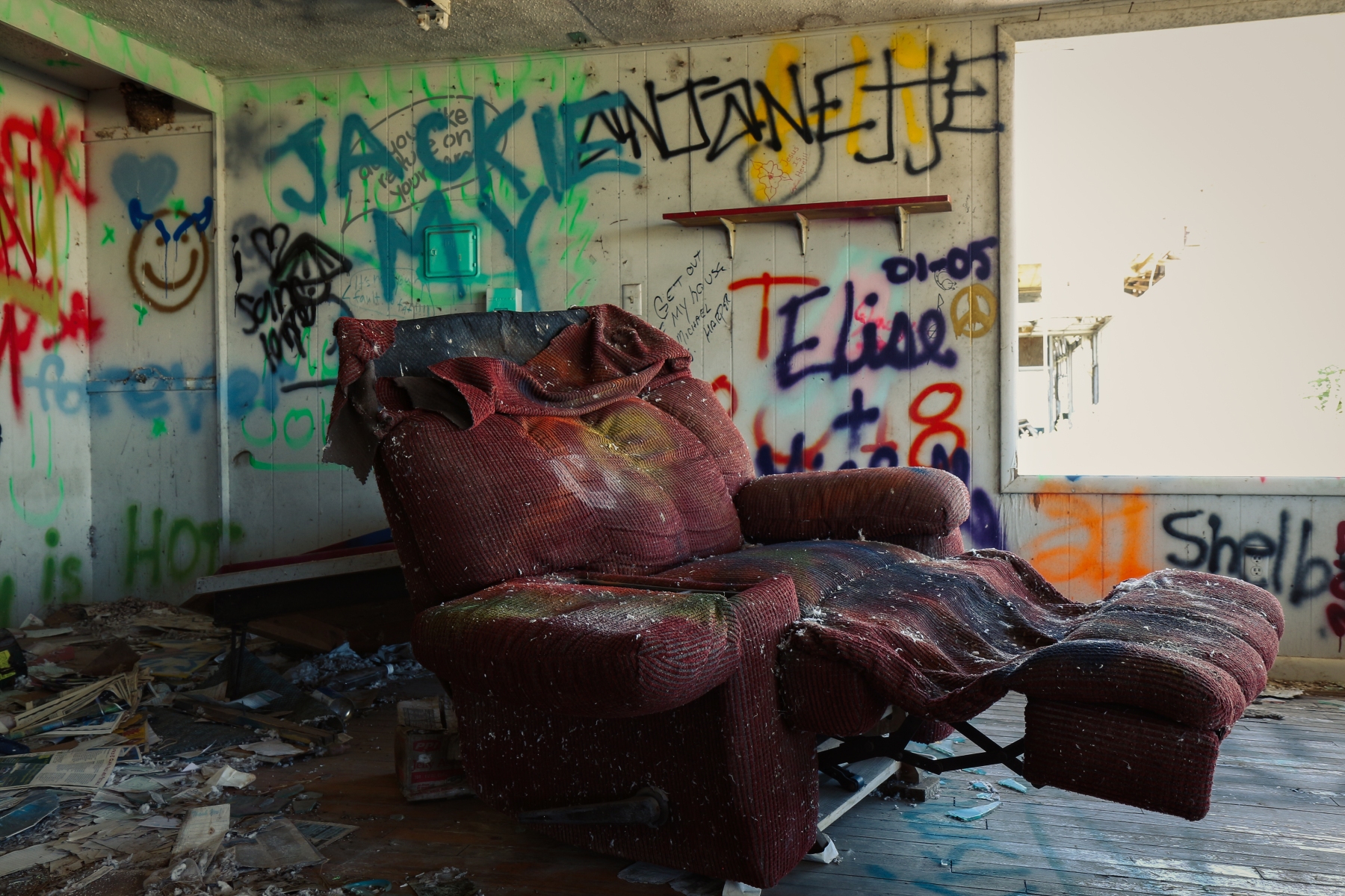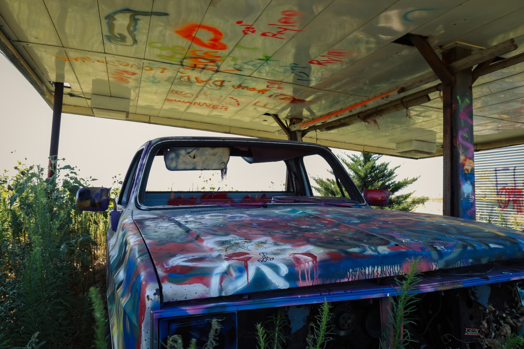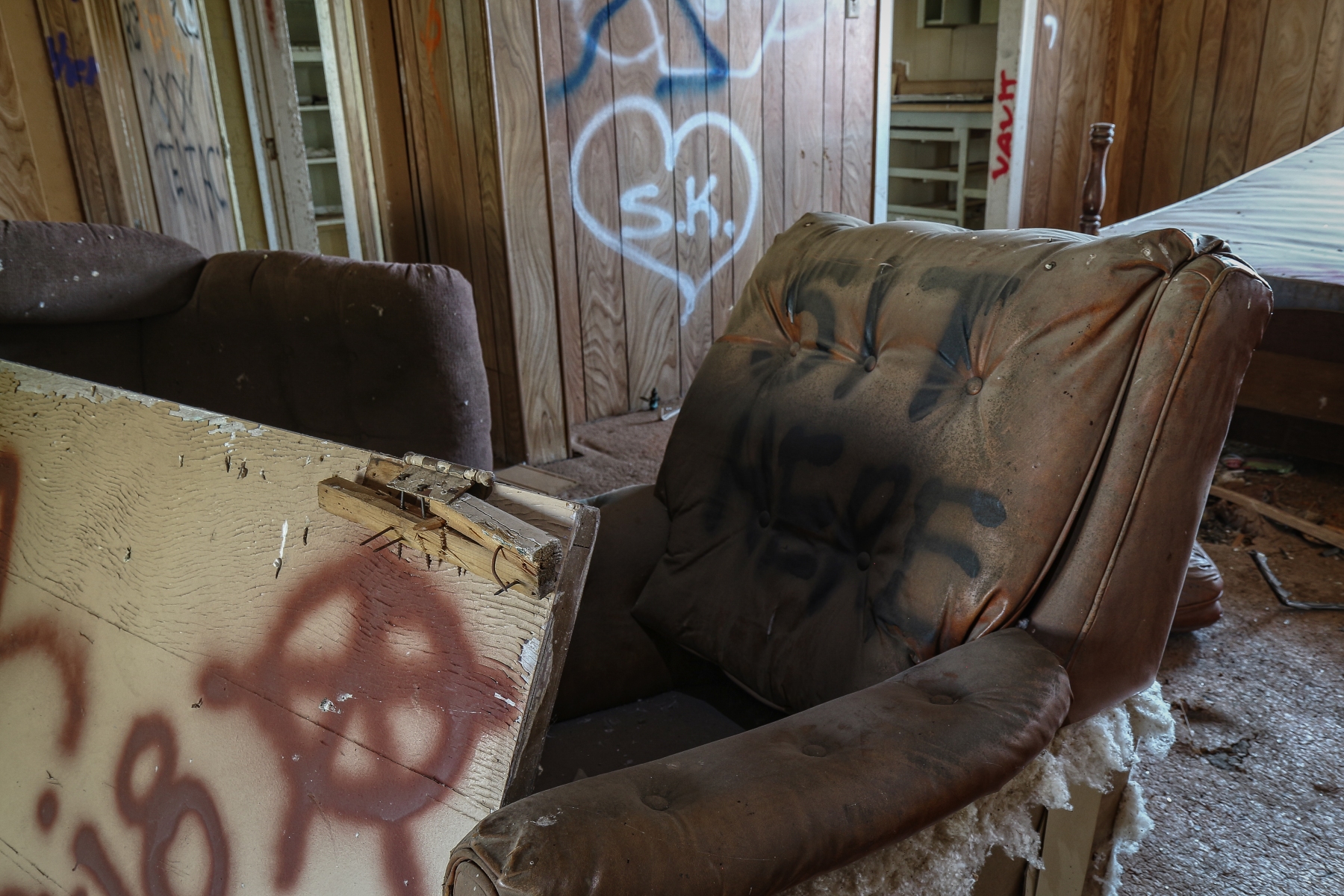 The Longhorn and Bug Ranches are now badly vandalized and the Beetles are covered with as much spray paint as their cousin to the West. Additional remains of Conway, a mile south, include a boarded up school (built in 1930), several small structures in conditions varying from barely holding on to piles of wood, residents of 3 newer houses, and 2 sets of grain elevators built next to an abandoned railway.