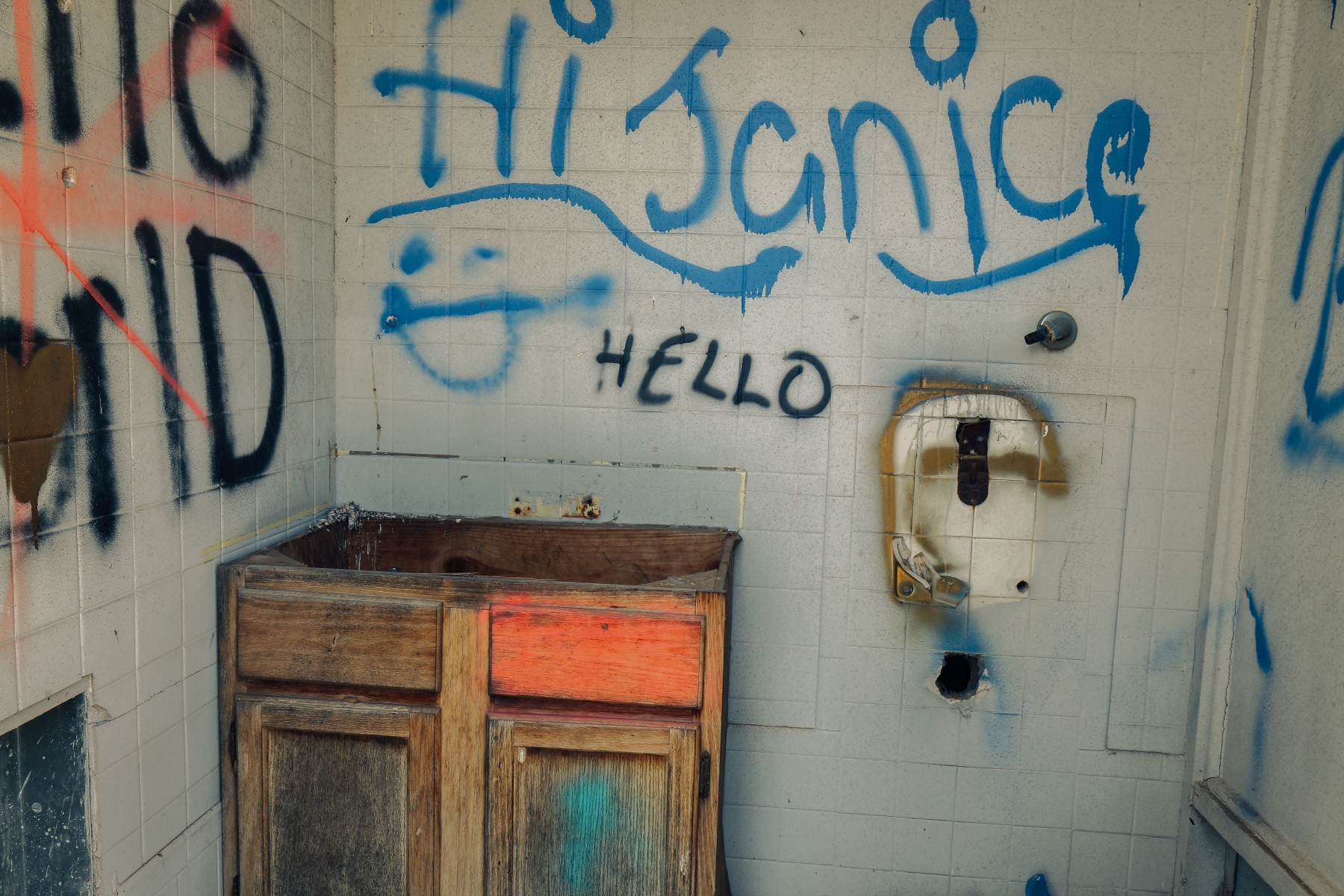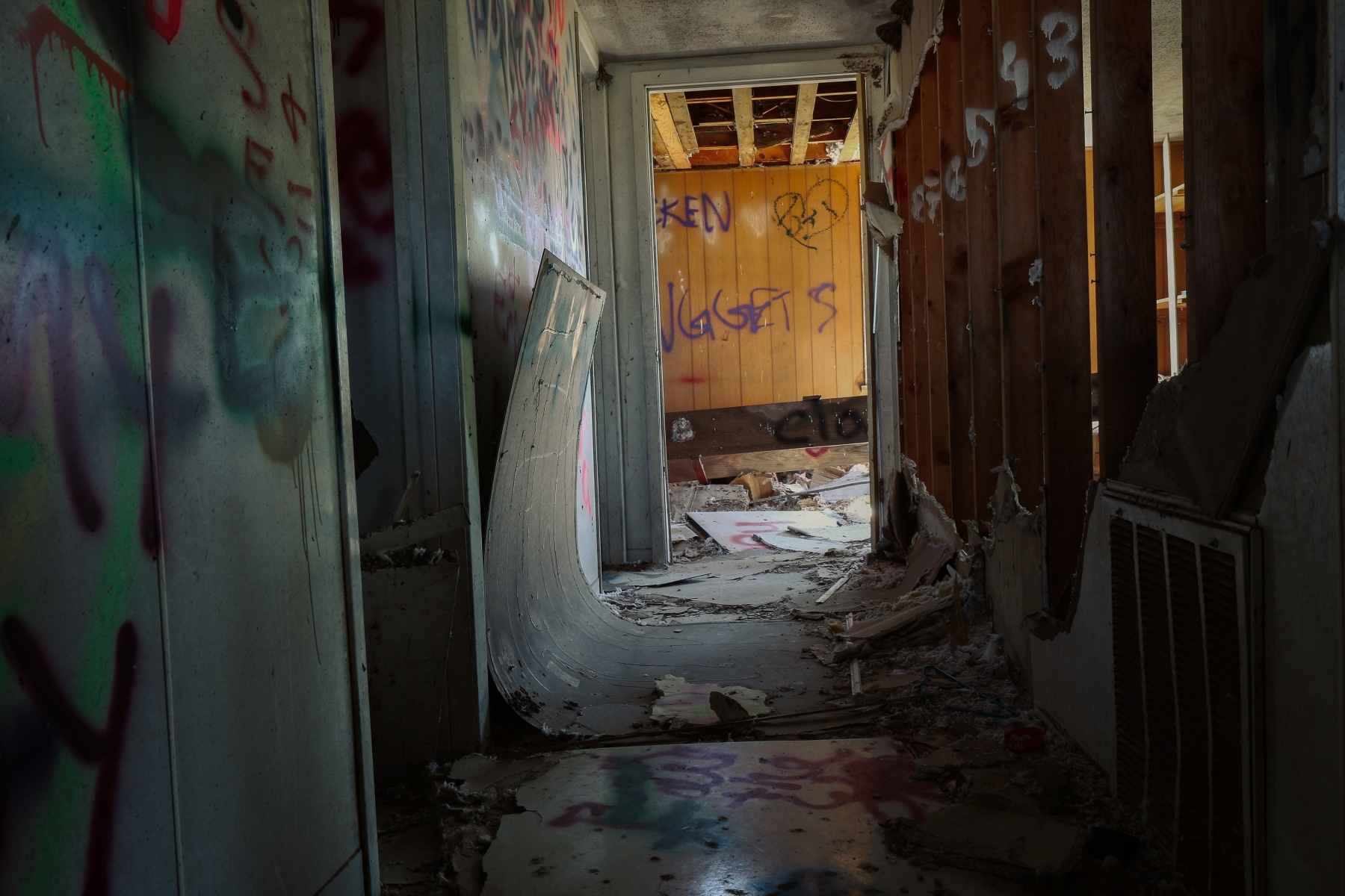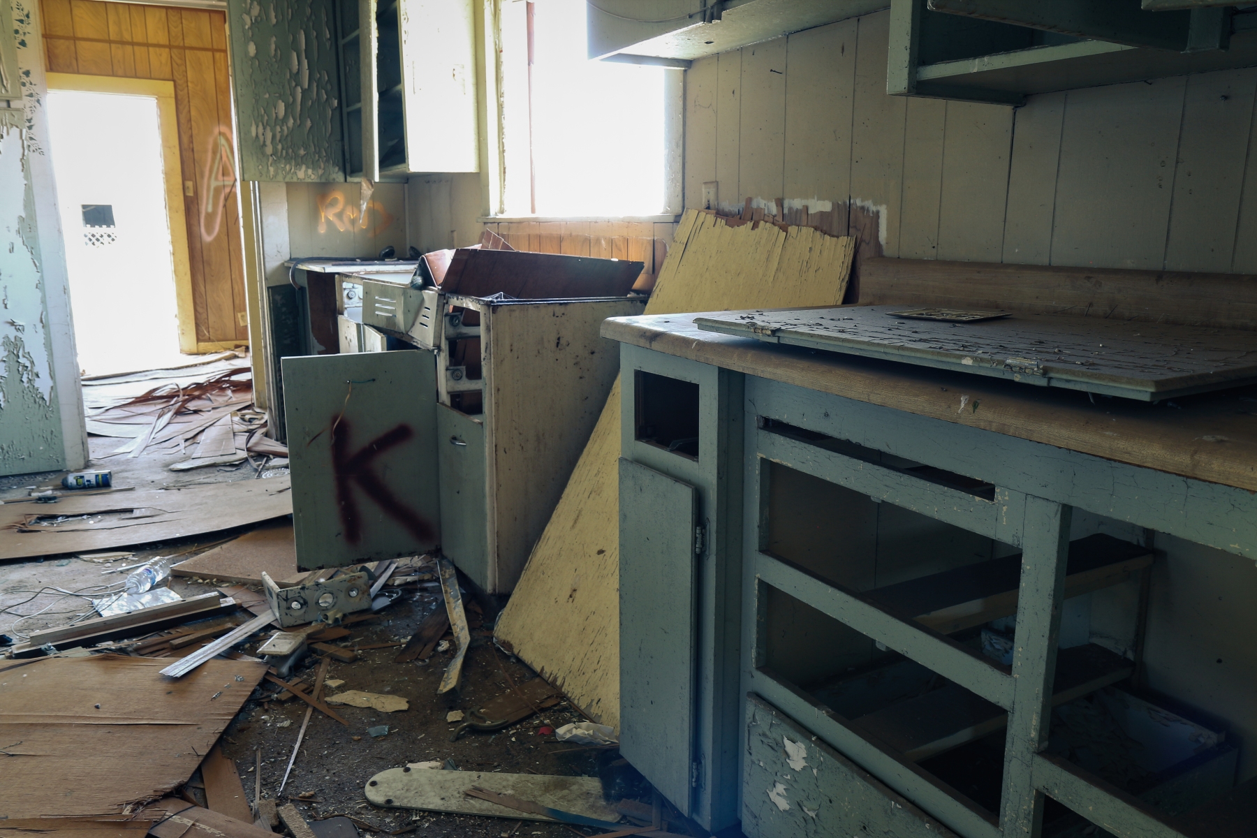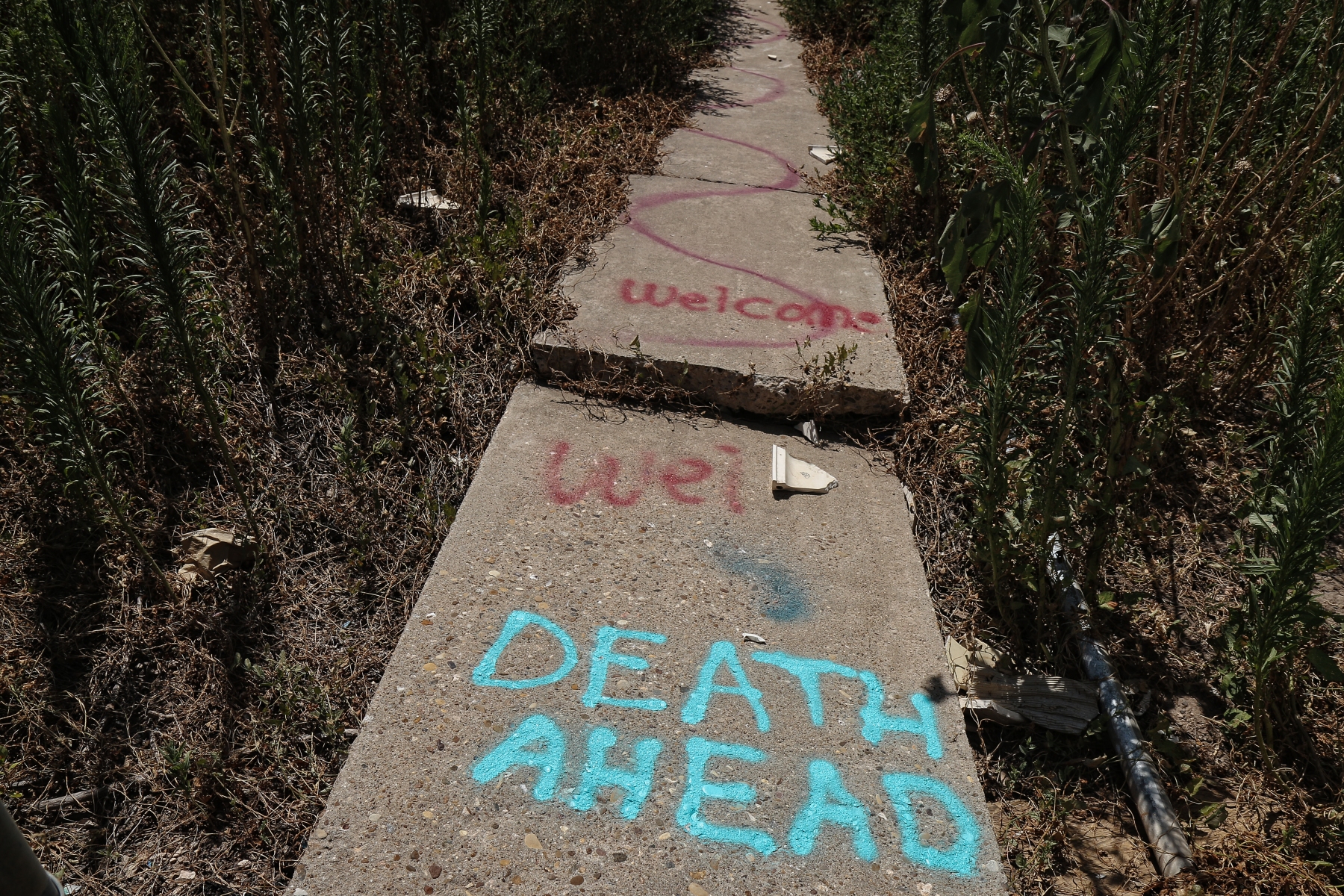 The Longhorn and Bug Ranches are now badly vandalized and the Beetles are covered with as much spray paint as their cousin to the West. Additional remains of Conway, a mile south, include a boarded up school (built in 1930), several small structures in conditions varying from barely holding on to piles of wood, residents of 3 newer houses, and 2 sets of grain elevators built next to an abandoned railway.