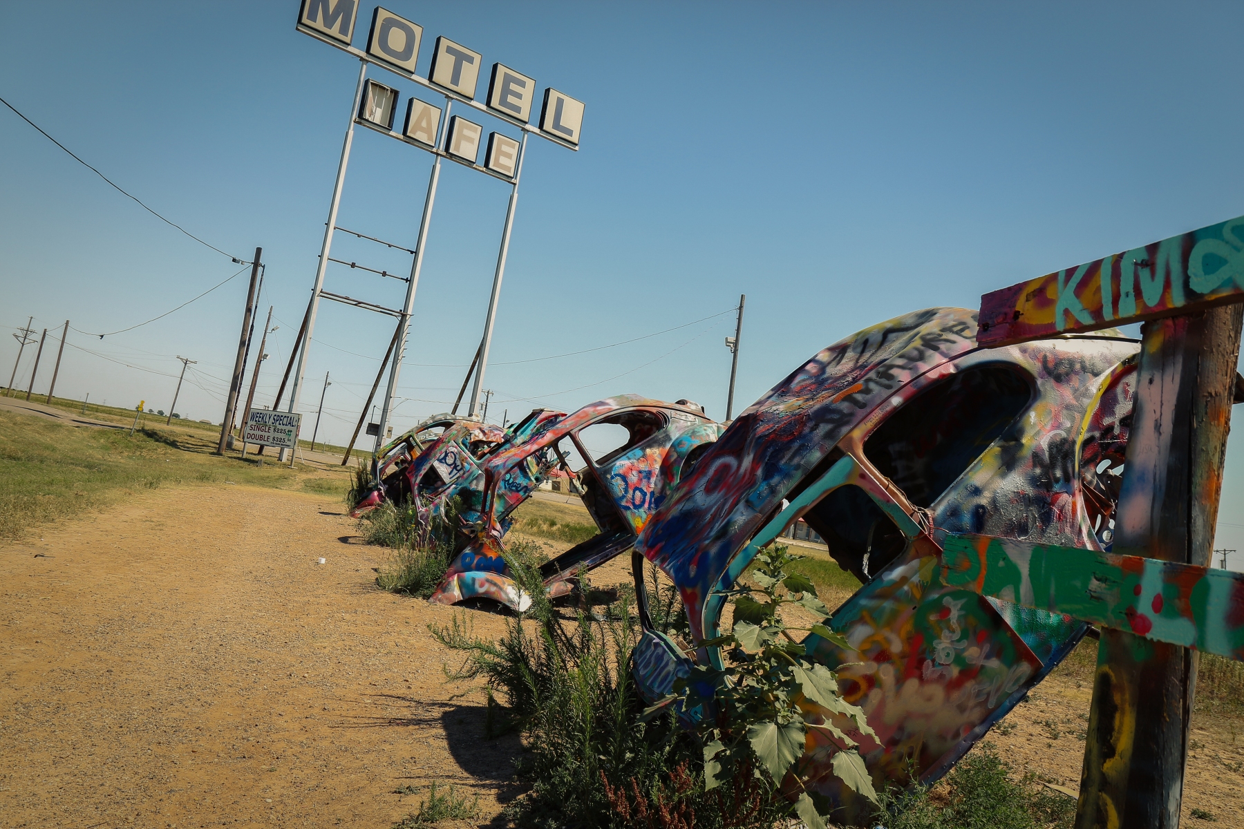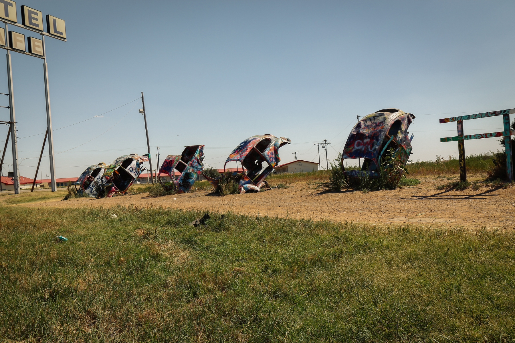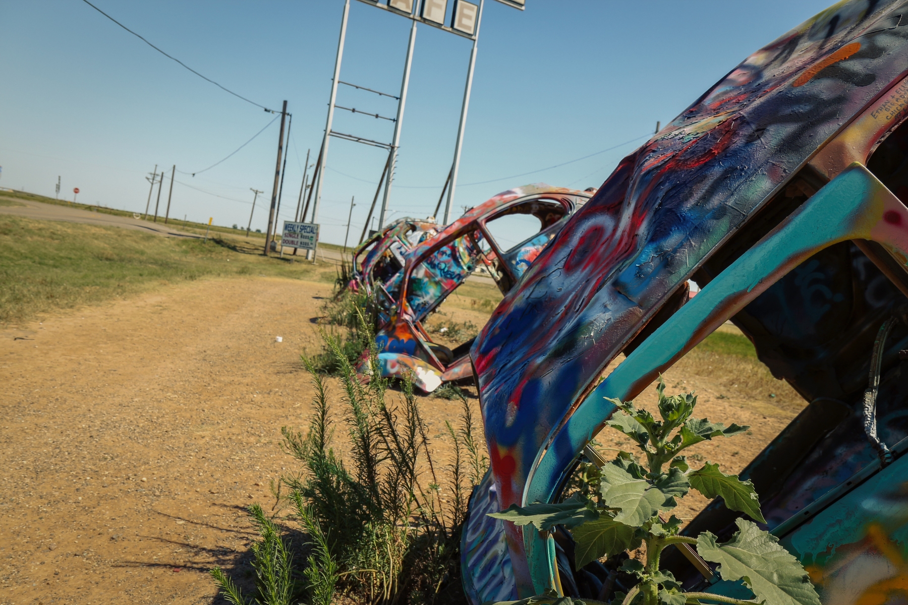 Eastbound travelers on Interstate 40 drive past an art installation called the Cadillac Ranch just before coming into Amarillo. It is a line of Cadillacs buried nose-first in the ground and covered with graffiti. About 30 miles after Amarillo is a similar sight, a line of Volkswagen Beetles lined up in similar fashion. This is part of the remains of a ghost town named Conway.