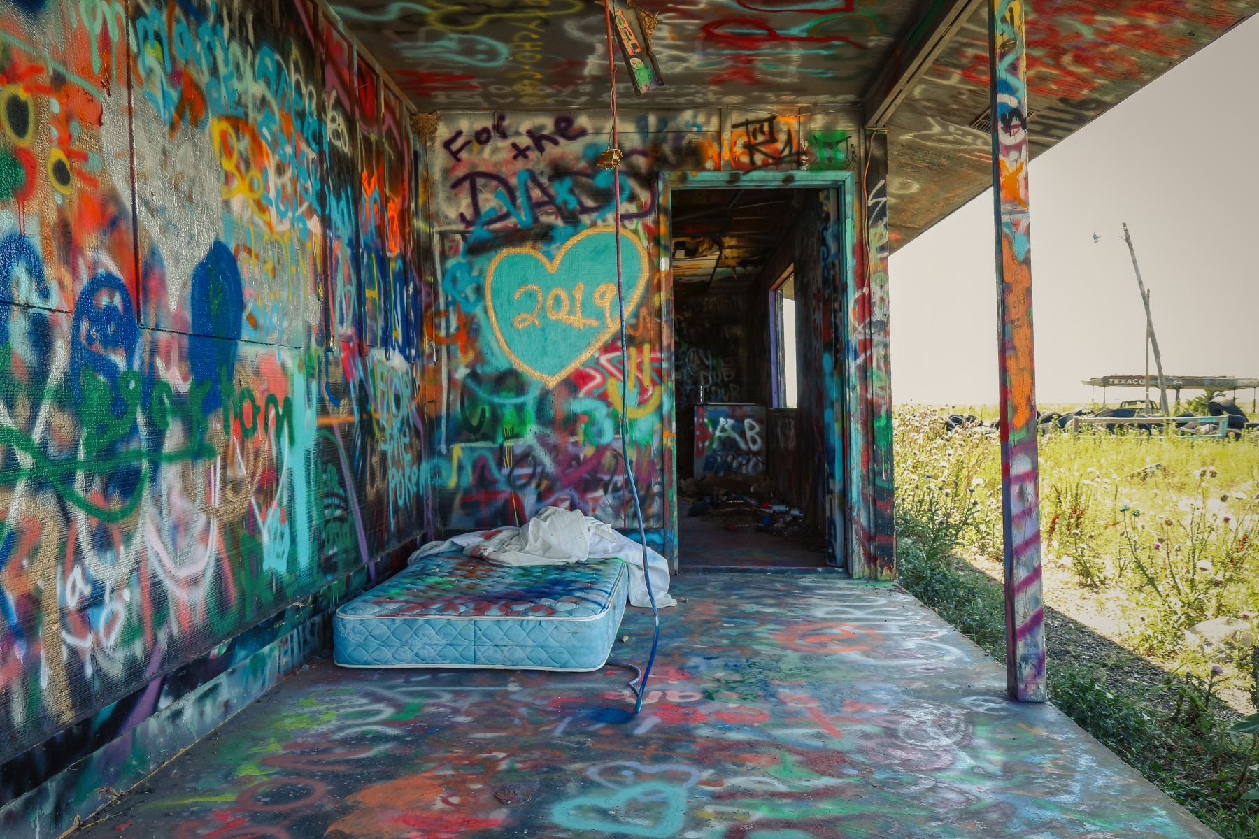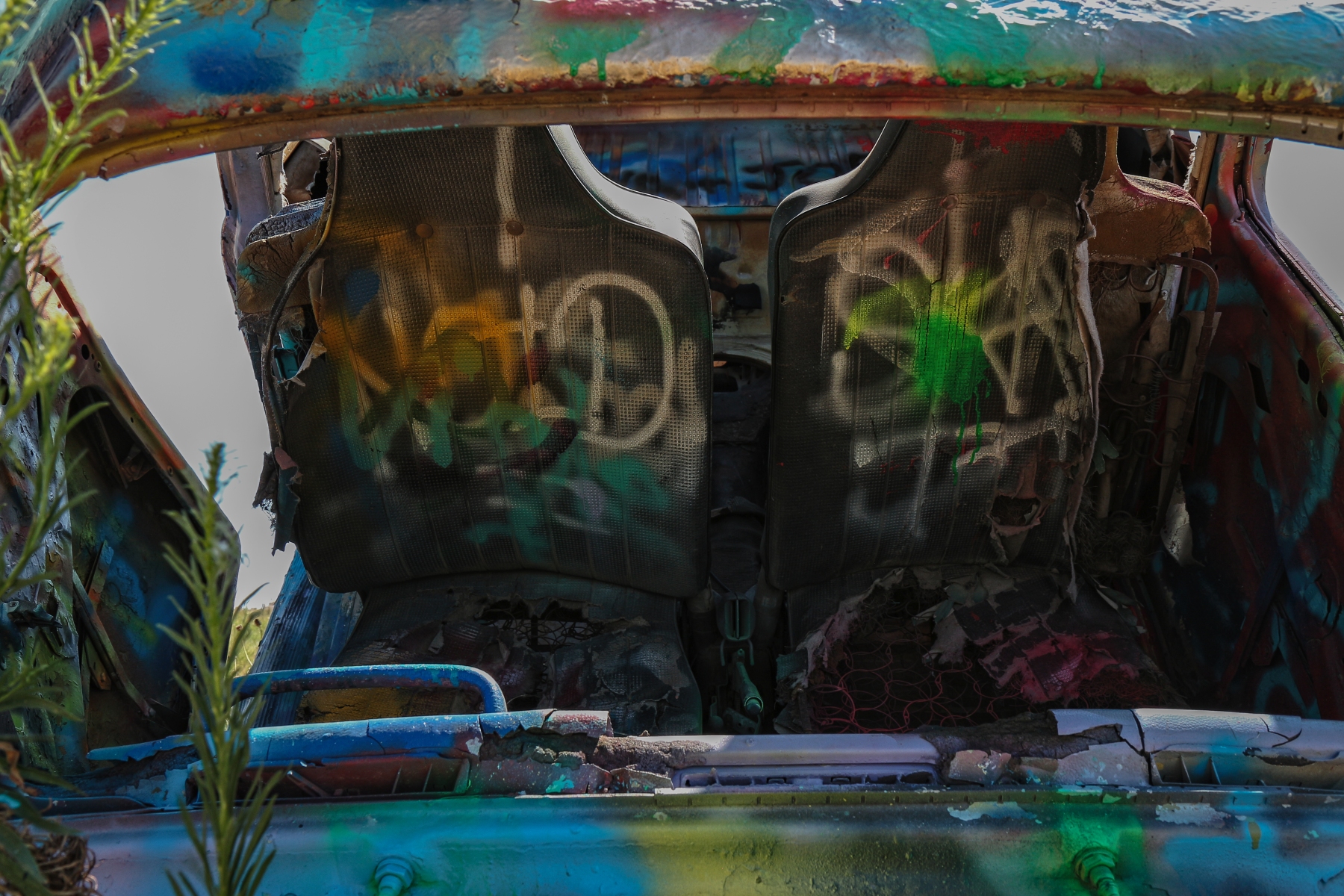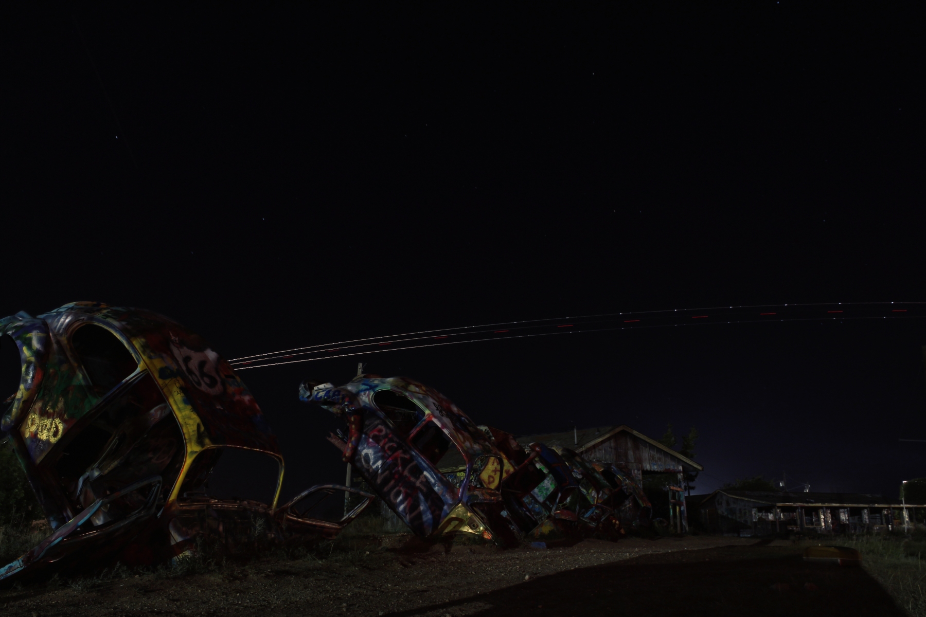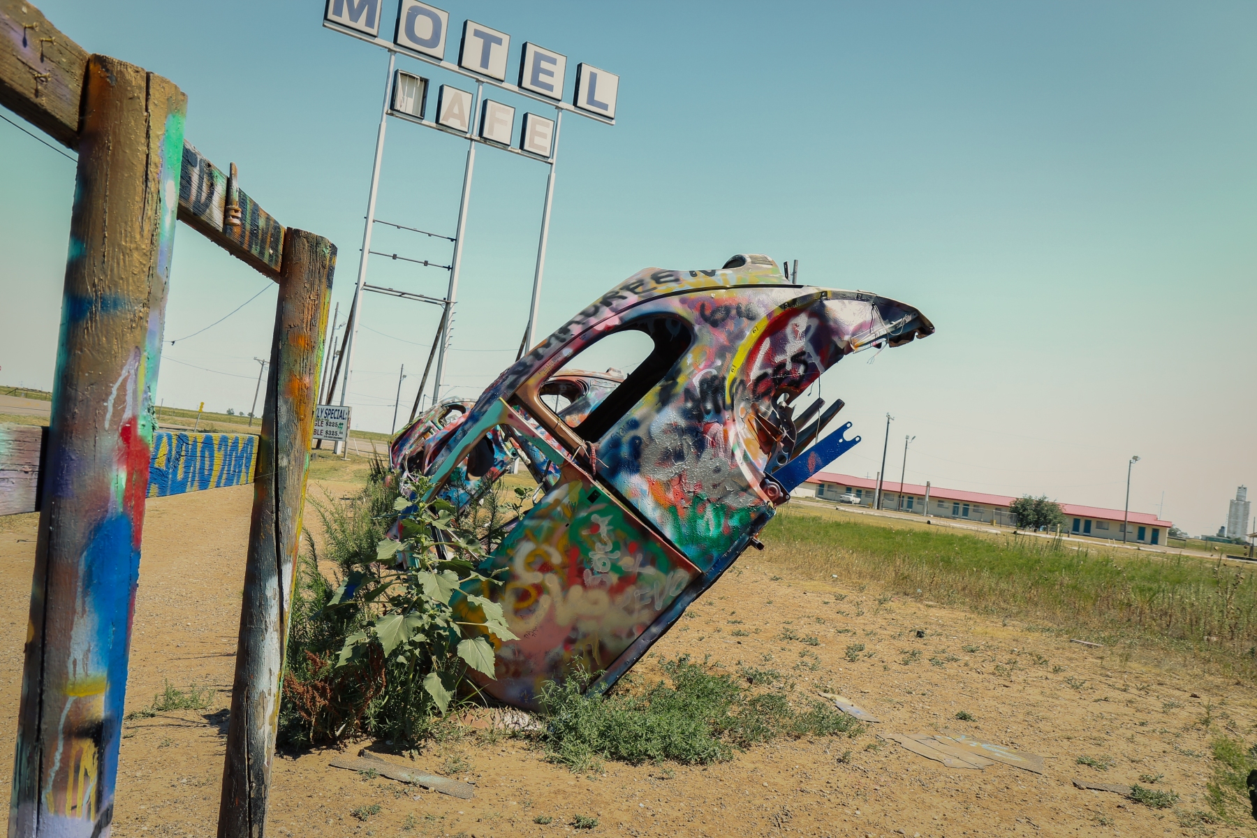 Eastbound travelers on Interstate 40 drive past an art installation called the Cadillac Ranch just before coming into Amarillo. It is a line of Cadillacs buried nose-first in the ground and covered with graffiti. About 30 miles after Amarillo is a similar sight, a line of Volkswagen Beetles lined up in similar fashion. This is part of the remains of a ghost town named Conway.