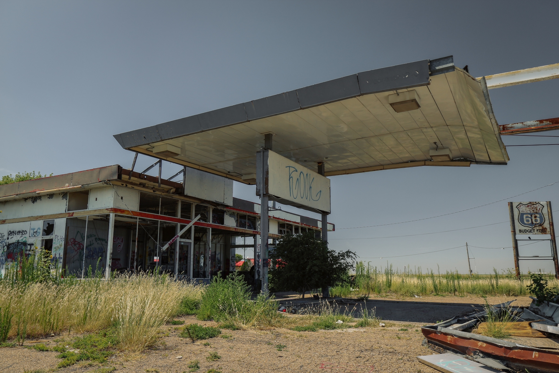 Conway was founded in the late 1800’s, long before becoming a Route 66 town in 1930. Much like many communities on the historic highway, creation of the Interstate system gave people a way to go further and faster in the late 1960’s. It especially hurt that this stretch was about a mile north of town. Residents adapted by moving businesses to the new Interstate exit and did pretty well for a couple years until a steep decline in 1970. The longest surviving business was a service station with a store named Longhorn Ranch and Rattlesnake Ranch attraction. No Interstate is complete without truck stops, so one was eventually built across the street in 2002. The service station owners decided to mimic the famous Cadillac Ranch and created the Bug Ranch. This only helped for a brief time because the business closed a year later.